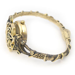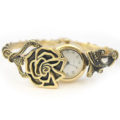 アンティークゴールドの薔薇に文字盤がすっぽり隠れた、まるでブレスレットみたいなバングルウォッチです。