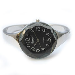 カットガラスが印象的な、バックルが付いたメタルバングルです。