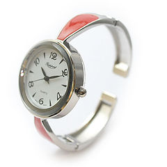 シンプルな丸型文字盤が見やすい、細めのメタルバングルです。